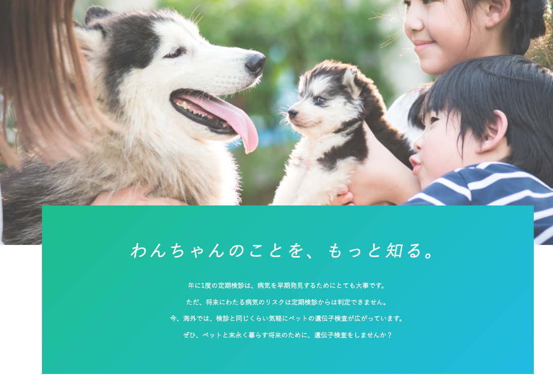 今、海外では、検診と同じくらい気軽にペットの遺伝子検査が広がっています。ぜひ、ペットと末永く暮らす将来のために、遺伝子検査をしませんか?